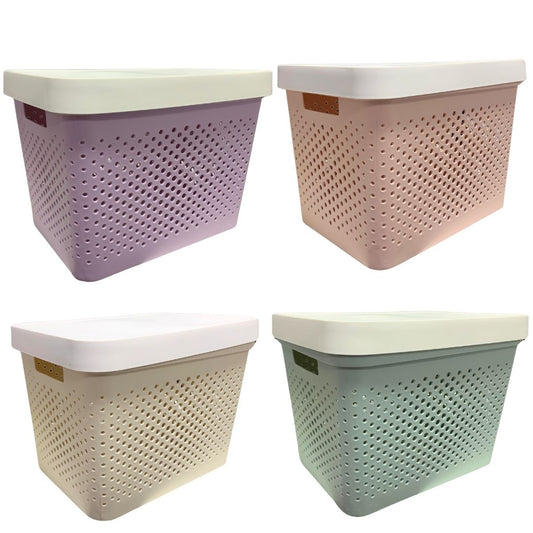 Canasto de Plástico Calado con Tapa y Asas - 37x27x27 cm, Colores Variados